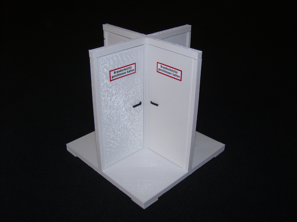 "NURSE" 4 in Kreuzform fixierte Brandschutztüren samt Türstock und Aufkleber "Brandschutztür geschlossen halten". Ein Mahnmal für den öffentlichen Raum. (chfs, 2018) 4 fire doors fixed in the shape of a cross with door frame and sticker reading “Keep fire door closed”. A memorial for the public space. (chfs, 2018) 3D-print by H.N.
